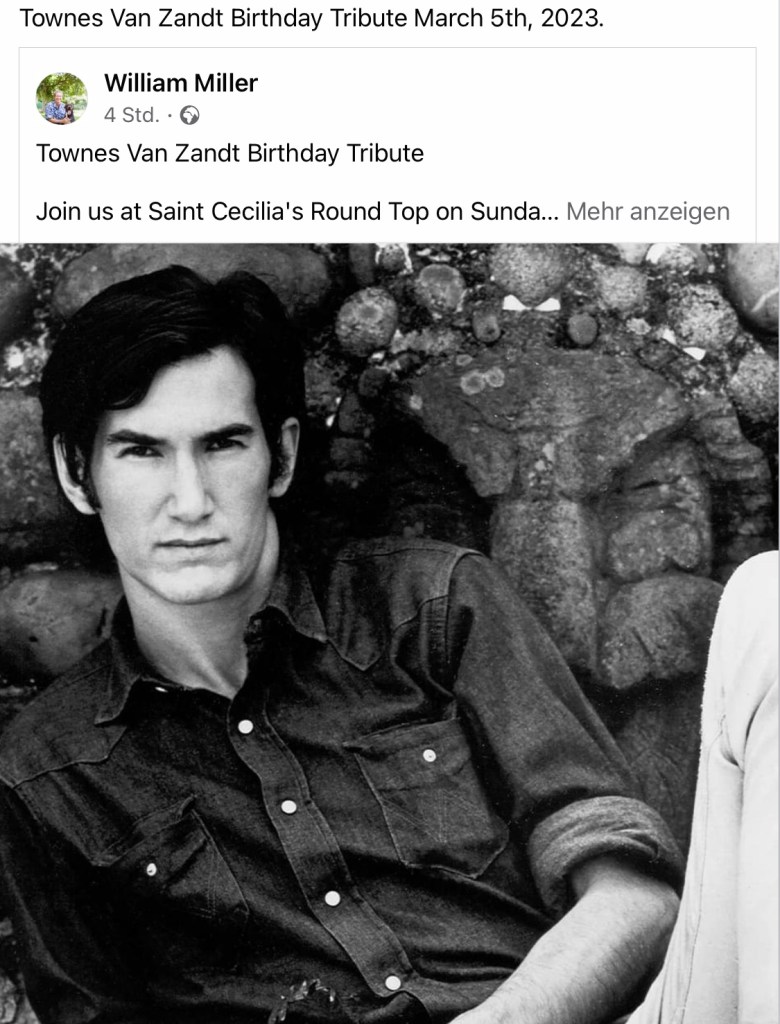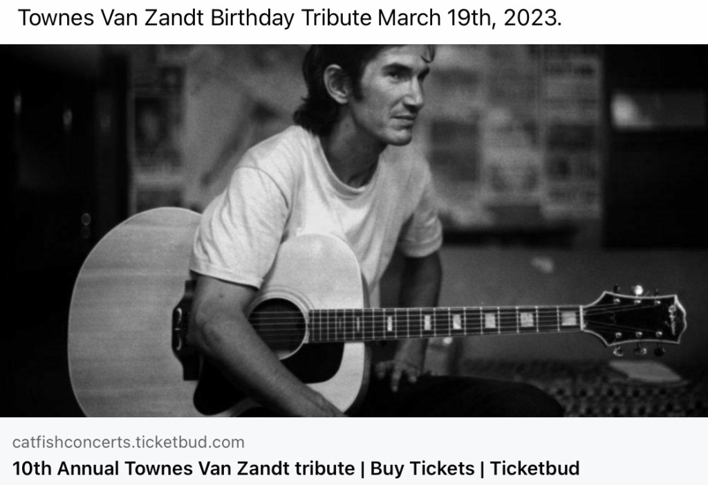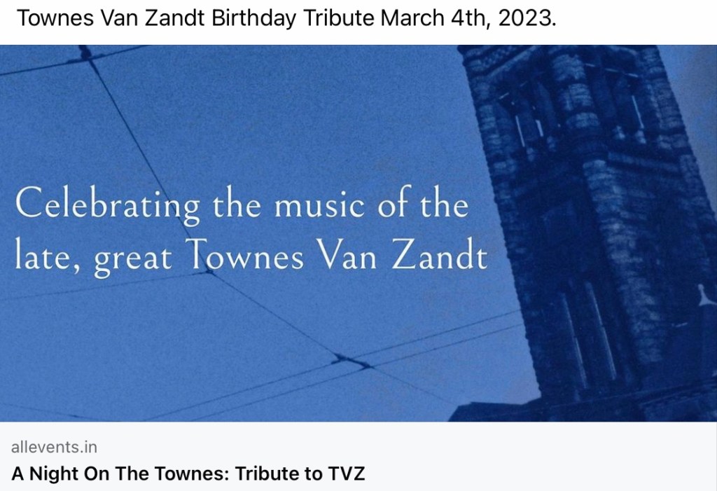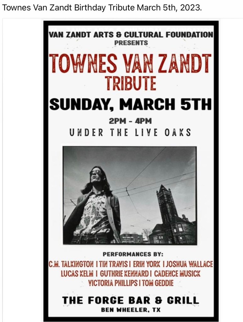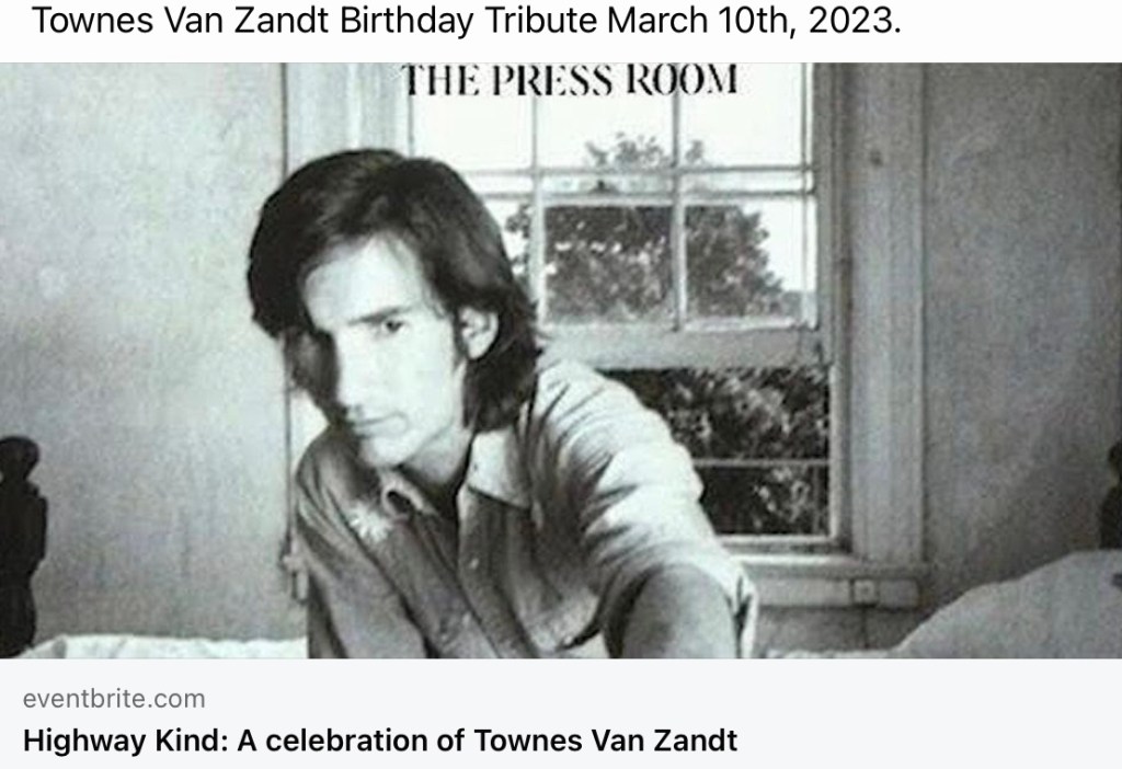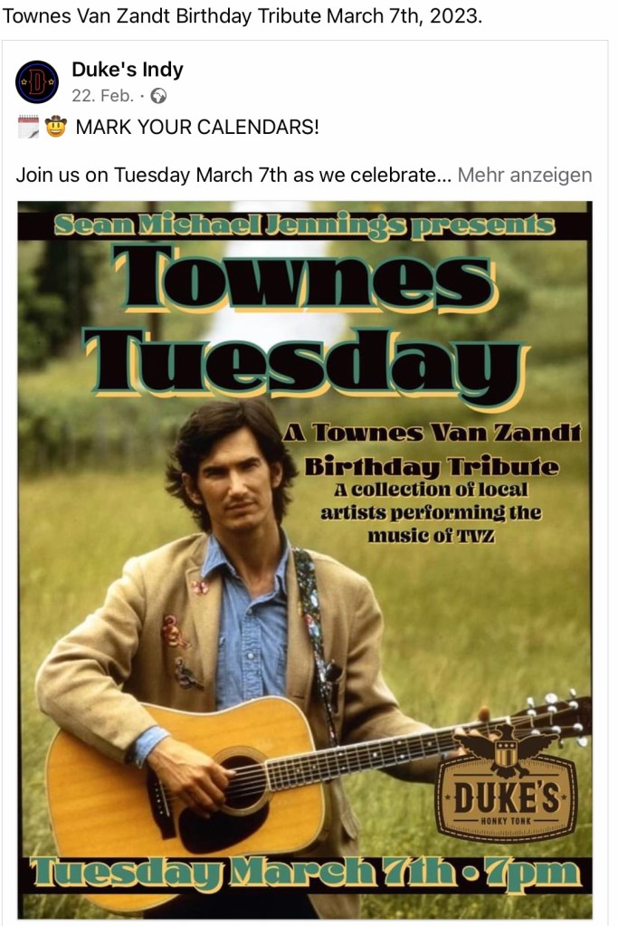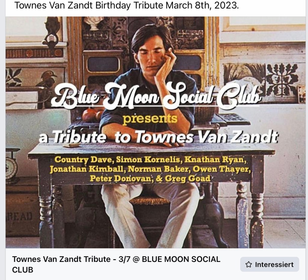 You‘ll find details about all upcoming Townes Van Zandt Tributes on his birthday in March 2023 here: https://www.facebook.com/townes20!