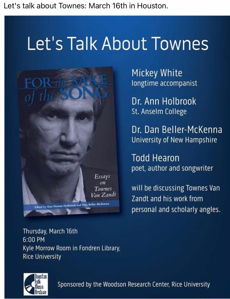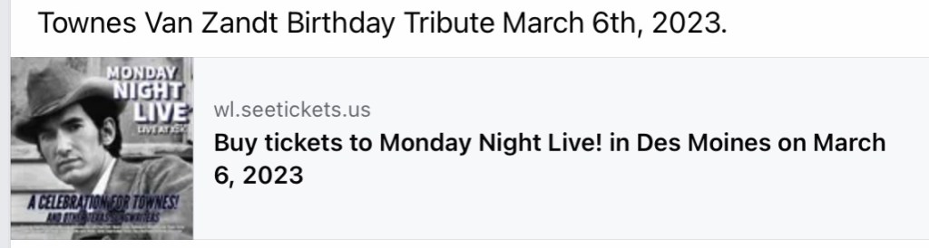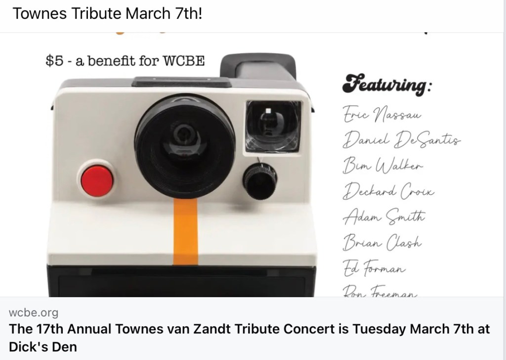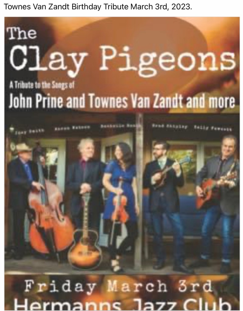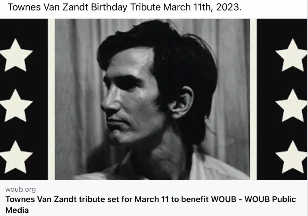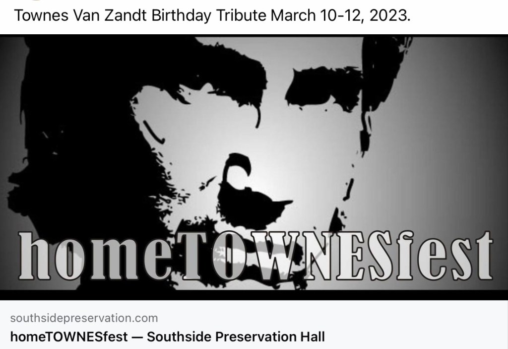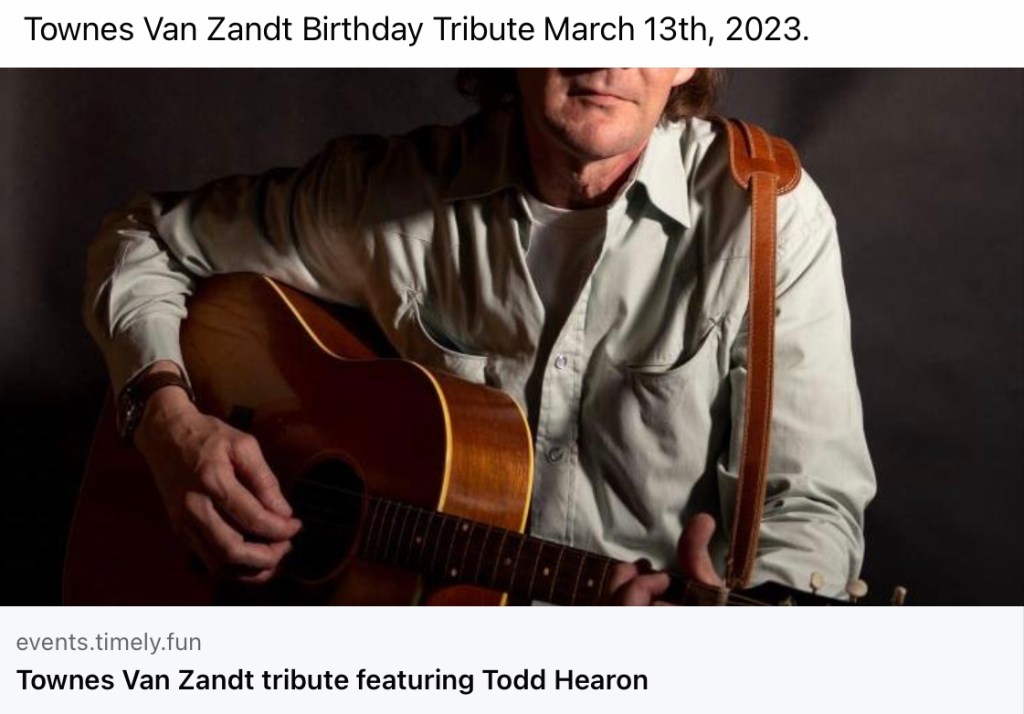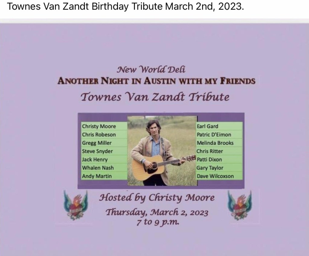 You‘ll find details about all upcoming Townes Van Zandt Tributes on his birthday in March 2023 here: https://www.facebook.com/townes20!