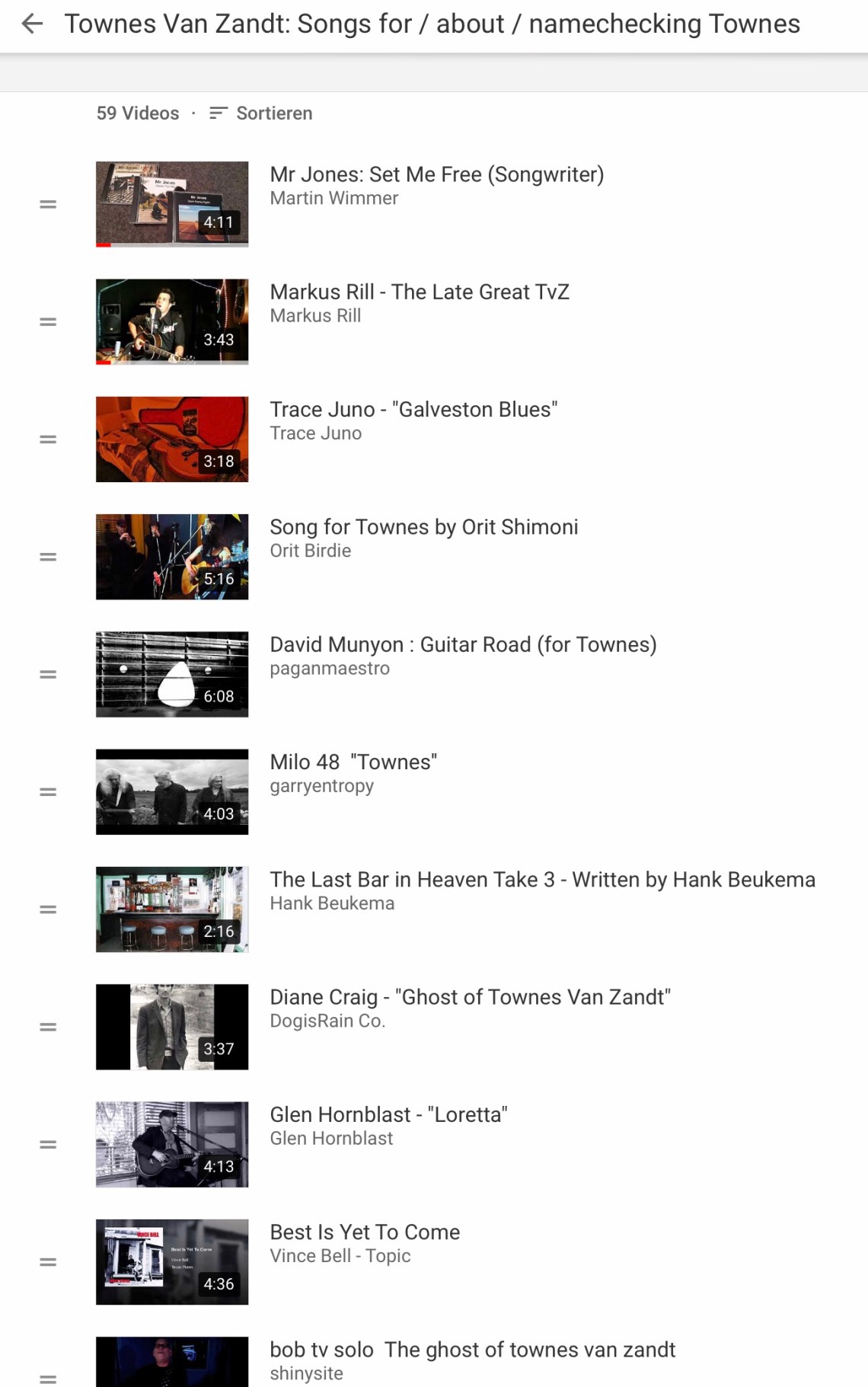 Ich hab euch eine Spotify und eine YouTube Playlist zusammengestellt mit allen Songs für Townes Van Zandt / Songs über Townes Van Zandt / Songs, die Townes Van Zandt erwähnen. Rund 100 Lieder…